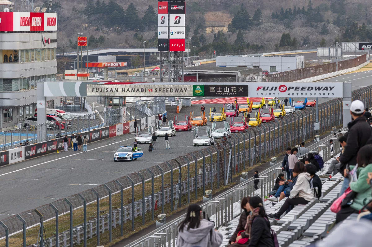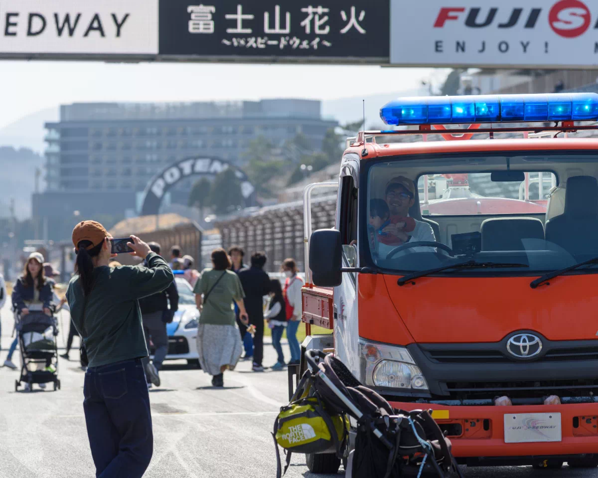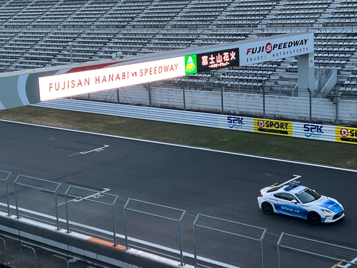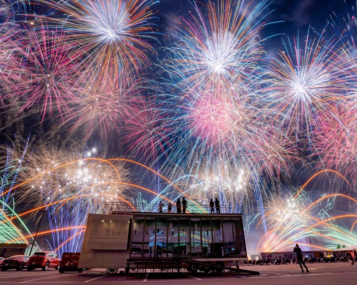 普段はレースが繰り広げられるこの場所で、花火大会の熱狂とクルマたちの存在感が交差する。