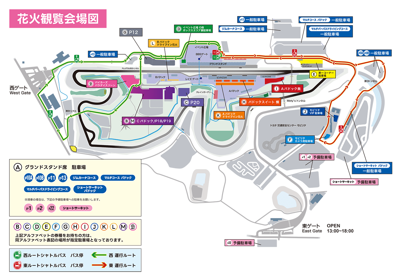 全席有料 グランドスタンド席、カメラ席3種、VIPルーム4種、リクライニングチェア2種、ドライブイン花火2種(Aパドック/Bパドック) 駐車場付き観覧エリア(Cパドック/P18,P19)、バイク専用ドライブイン花火 |