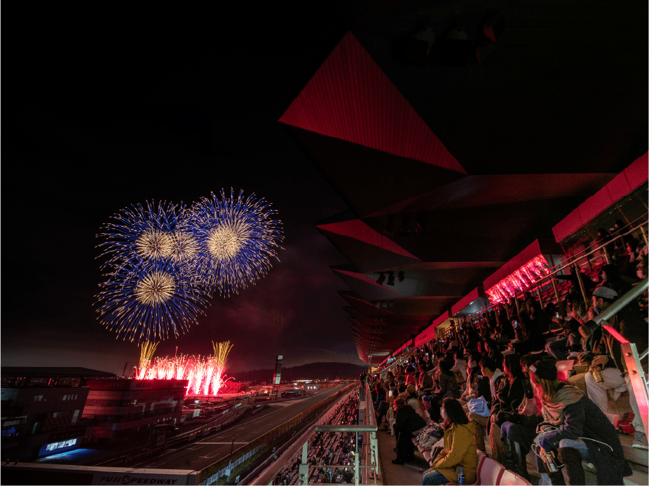 ・車と花火の共演を見ることが出来るベストポジション!花火はこのグランドスタンド席の正面から打ち上がります。眼下には約1.5Kmのホームストレートが広がっていますので、オープニング時と花火プログラム中に、駆け抜ける車たちと花火が共演をフルに目撃していただけます。日中のサーキット上でのプログラムを最も堪能できるエリアです。