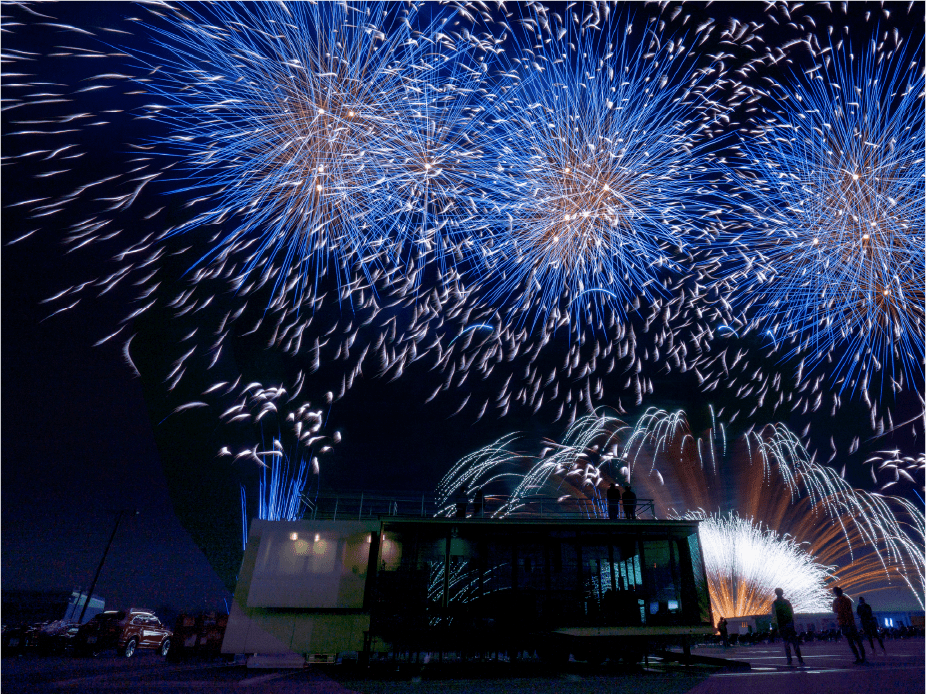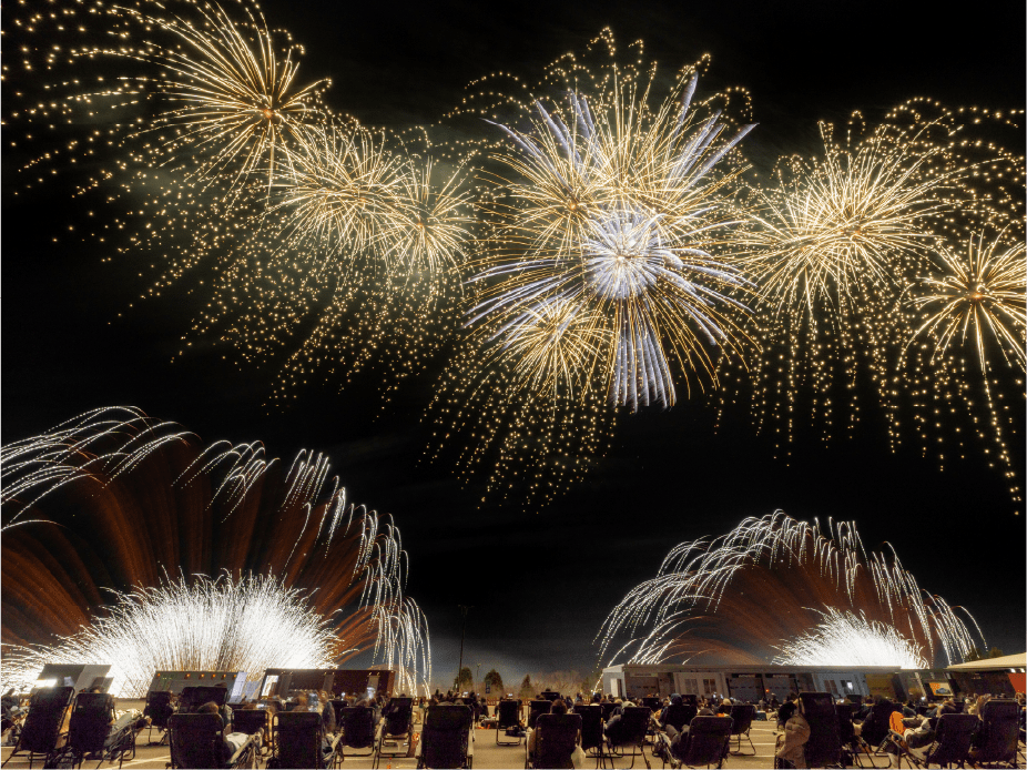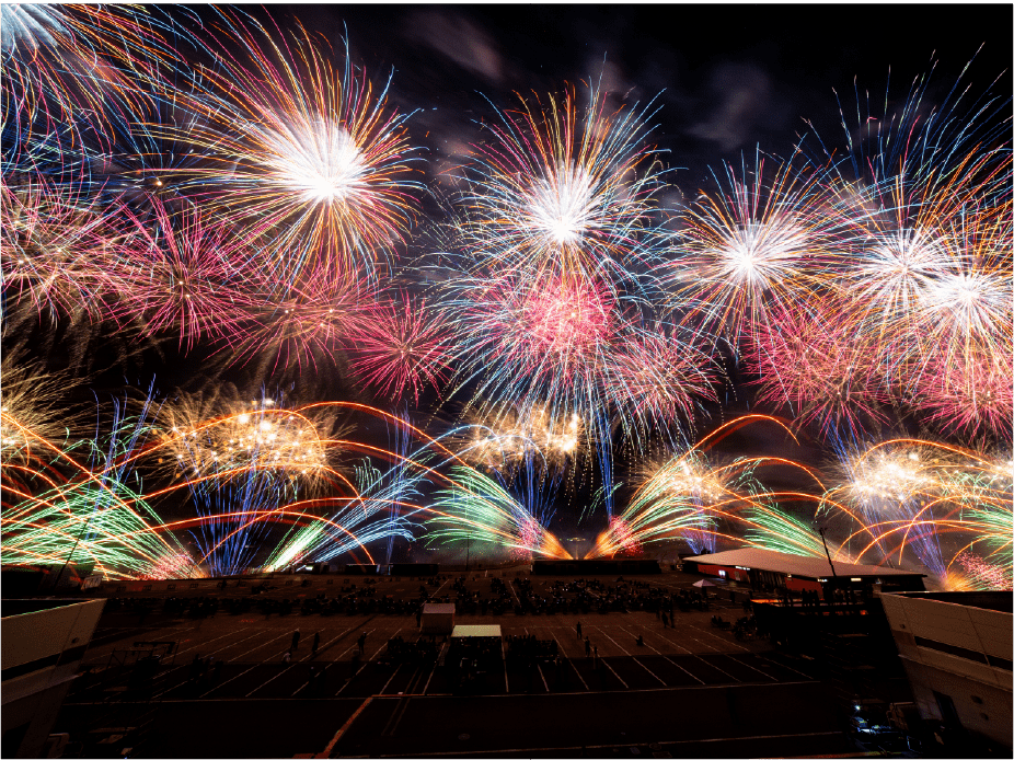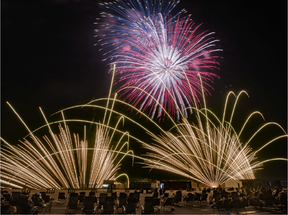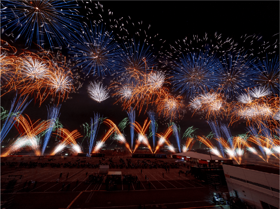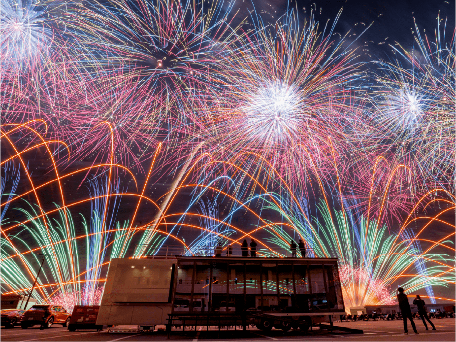 ・今年は眼前に広がる大きなモビリタ駐車場に、新しく花火打上ポイントをたくさん設置しました。モビリタから打ち上がる花火は最大8号玉。筒から打ち上がる瞬間の花火もお楽しみいただけます。