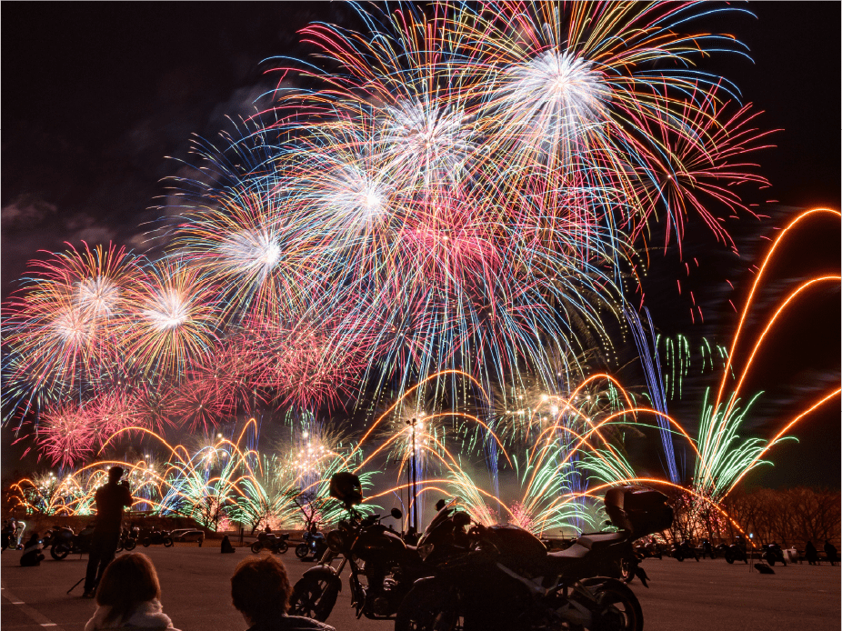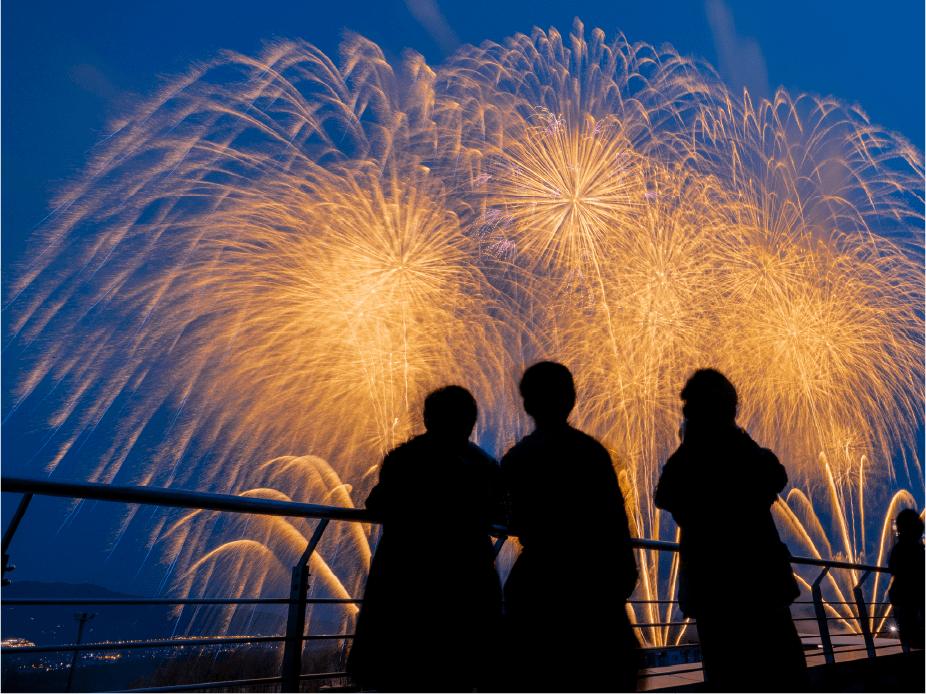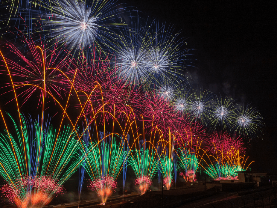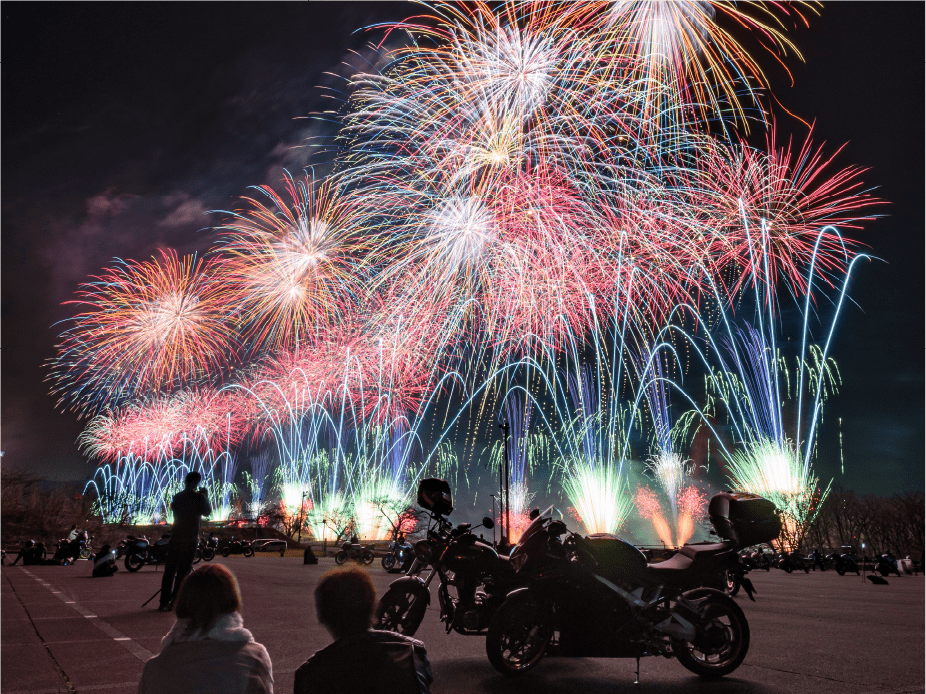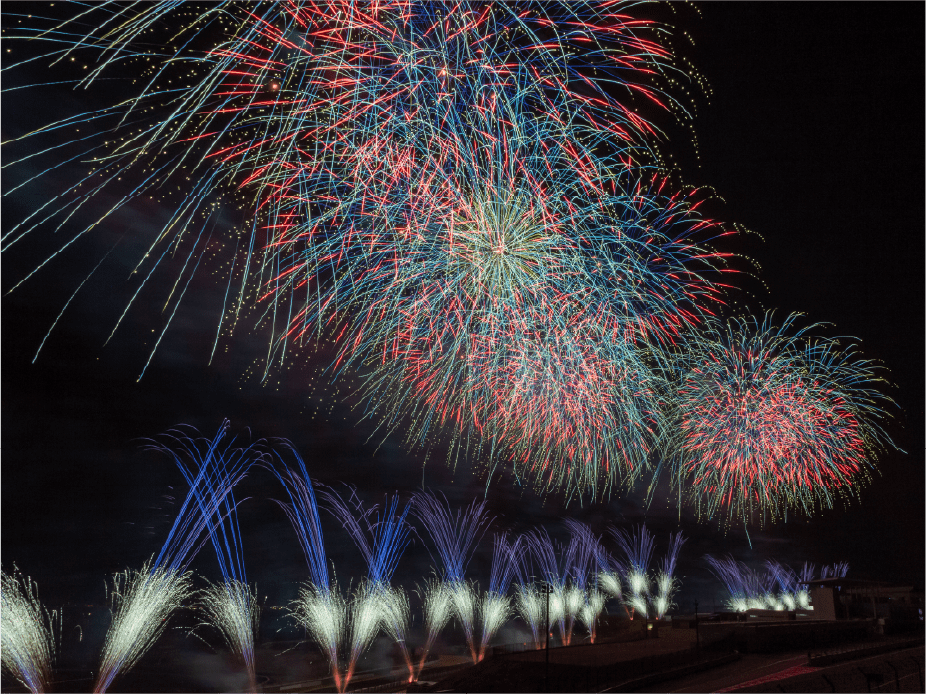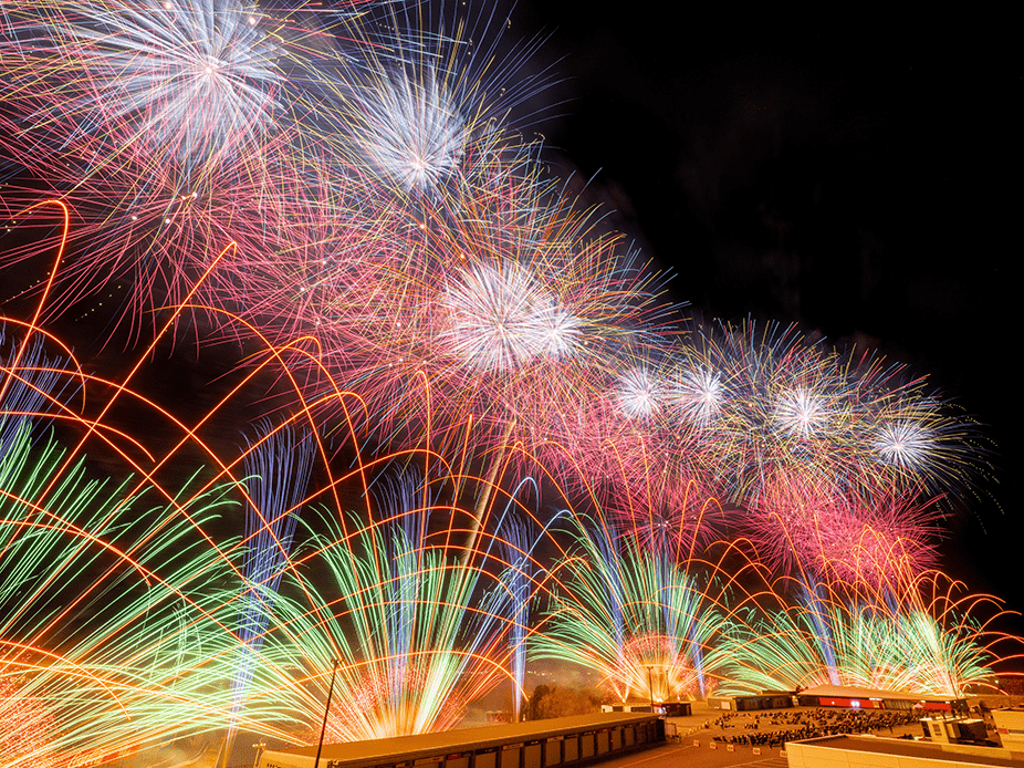 ・今年は眼前に広がる大きなモビリタ駐車場に、新しく花火打上ポイントをたくさん設置しました。モビリタから打ち上がる花火は最大8号玉。筒から打ち上がる瞬間の花火もお楽しみいただけます。