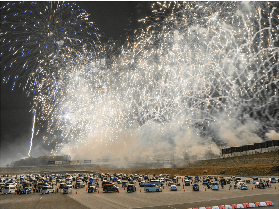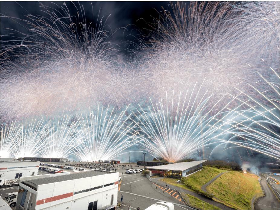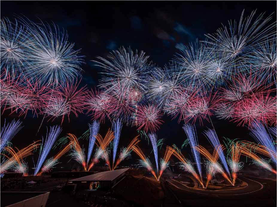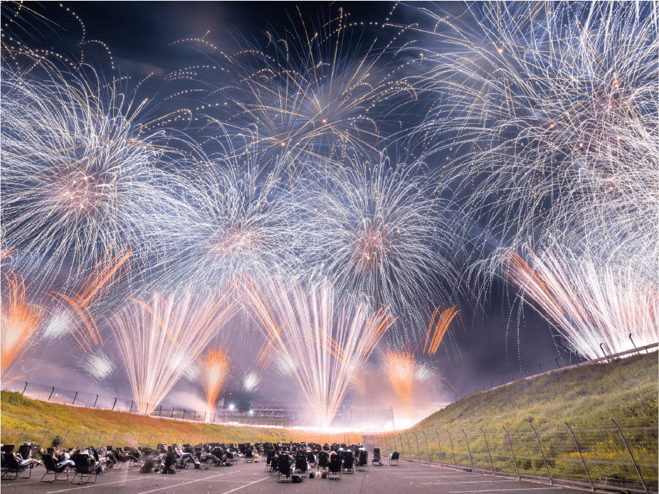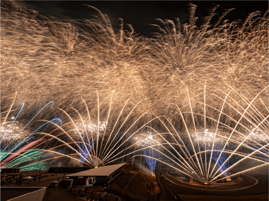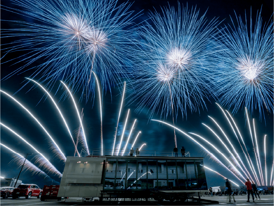 ・今年は第1コーナー正面に広がるモビリタ駐車場に花火打上ポイントをたくさん作りました。第1コーナーからであれば、筒から打ち上がる瞬間も撮影出来るかも!