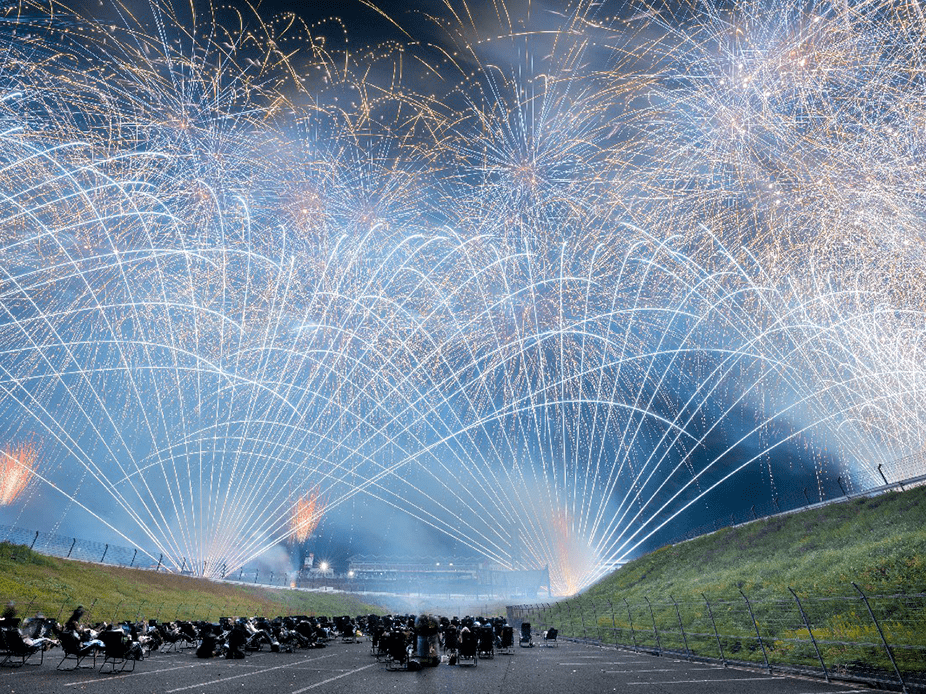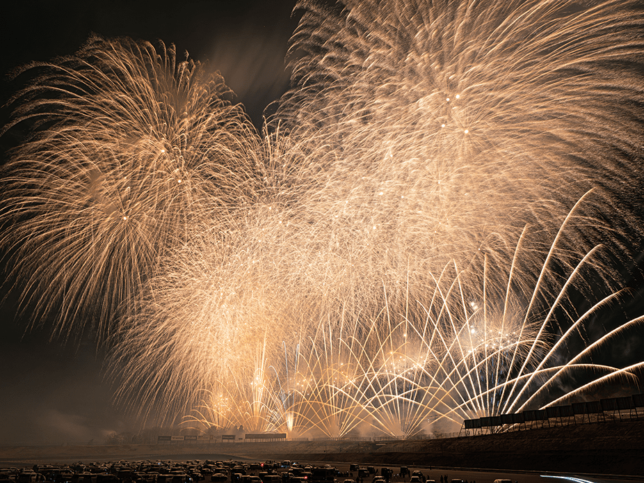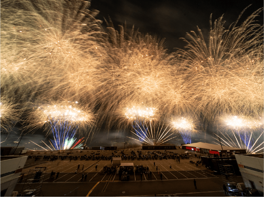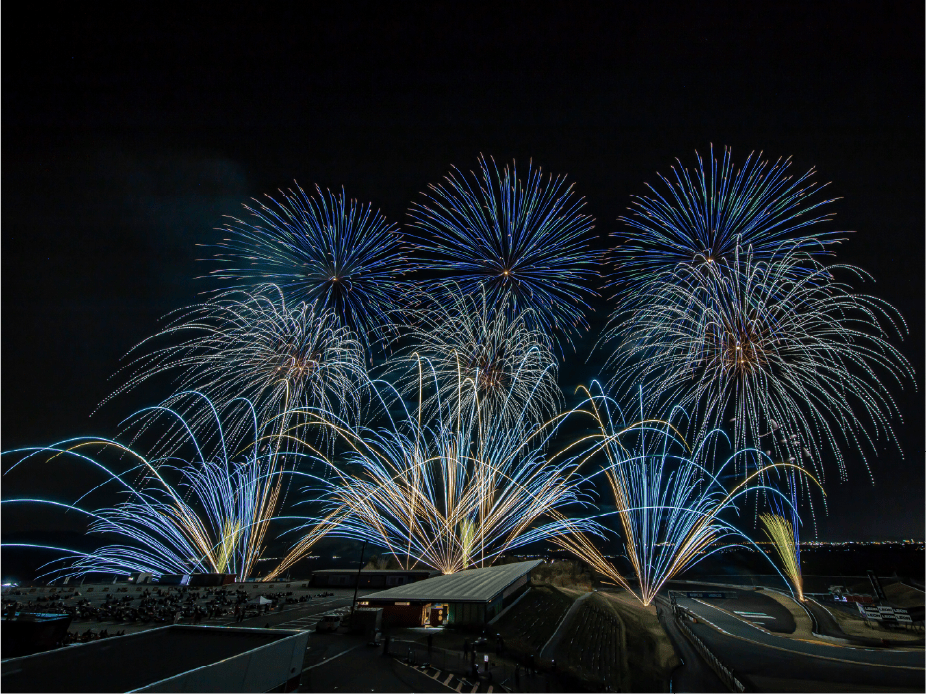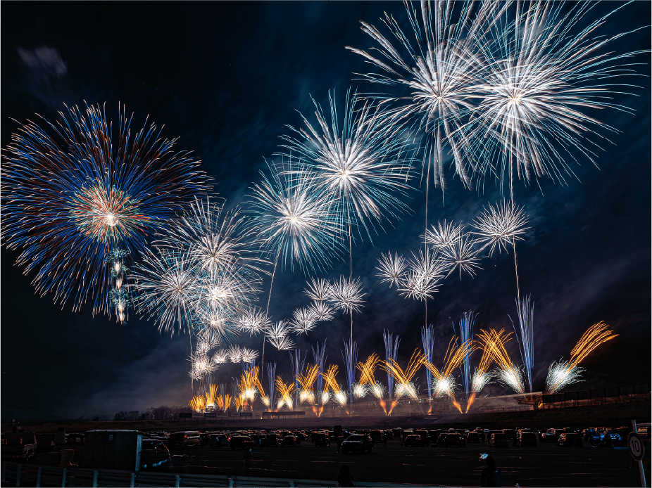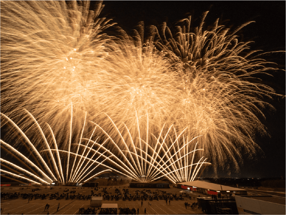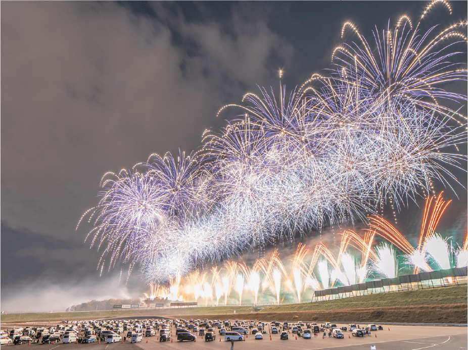 ・今年は第1コーナー正面に広がるモビリタ駐車場に花火打上ポイントをたくさん作りました。第1コーナーからであれば、筒から打ち上がる瞬間も撮影出来るかも!