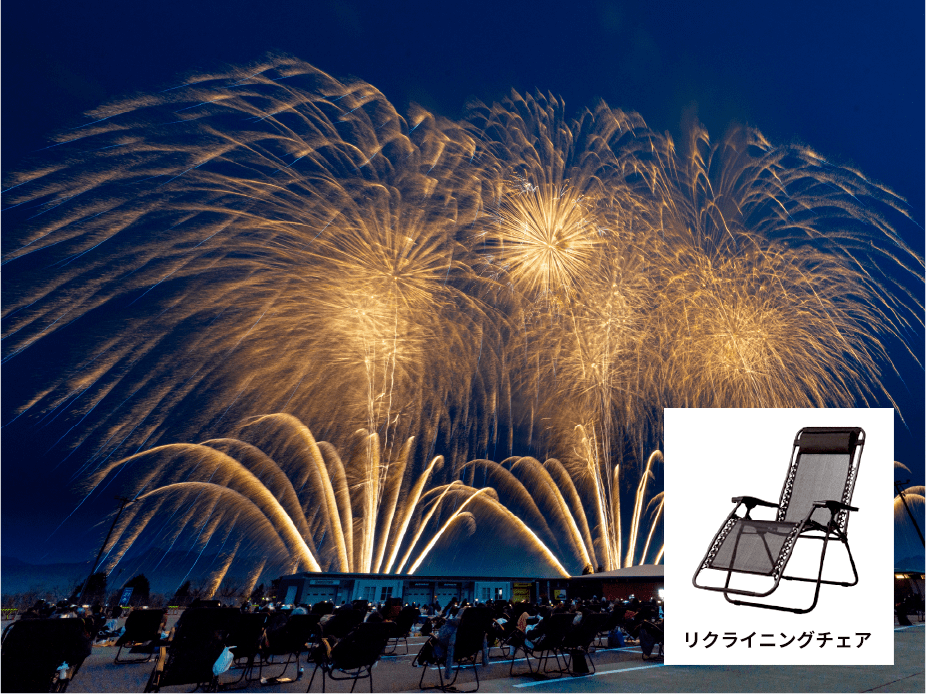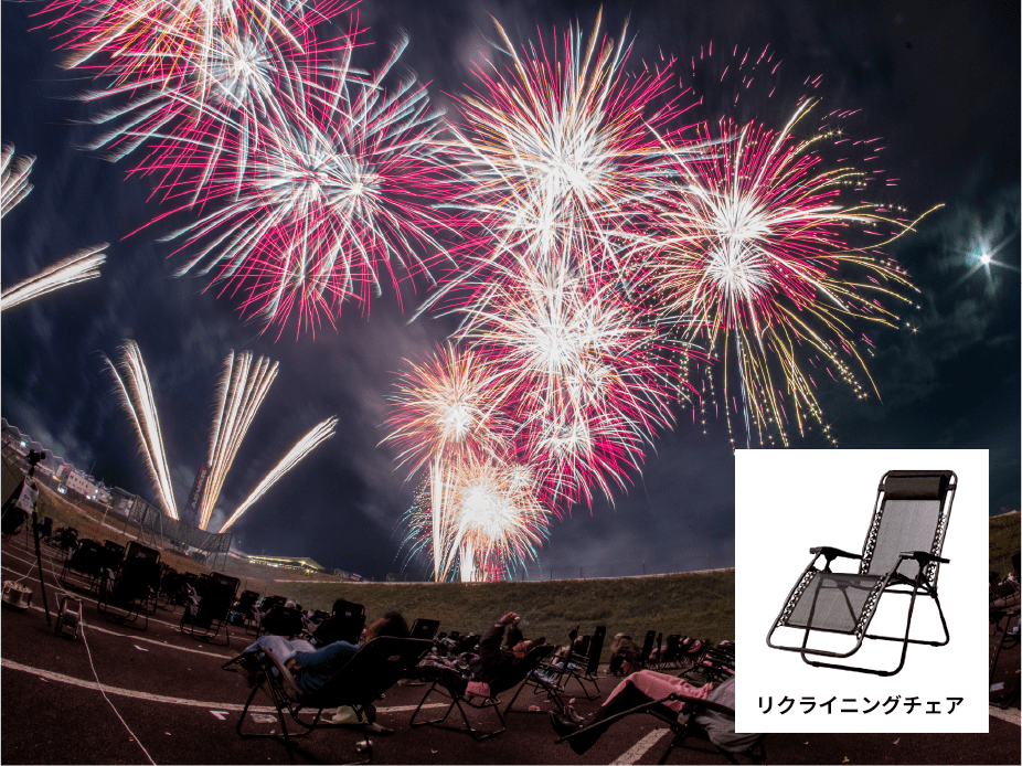 ・普段のレースの時にはレーサーやレース関係者しか入れない特別なエリア「パドック」内に、リクライニングチェアをご用意。(普通の椅子に座っての観覧では首が痛くなり見上げるのが辛くなるほど花火から近いエリアです。)