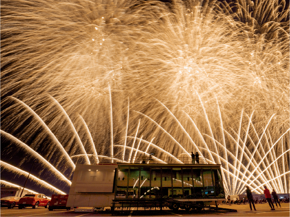 ・華やかなパドック内にあるピットビルBの屋上は、サーキットのホームストレートと、花火打上エリア、両方を見下ろすことが出来る最高に特別な場所です。ホームストレートでの車と花火の共演、日中のサーキットプログラム、そして本番の花火打上、全てを堪能できるVIPエリアです。