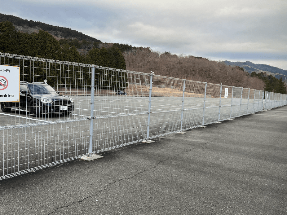 ・サーキットのホームストレートは、車を駐車スペースに停めていただき車外に出て後ろを振り返ると一部見えますが、高いフェンスのネット越しとなります。