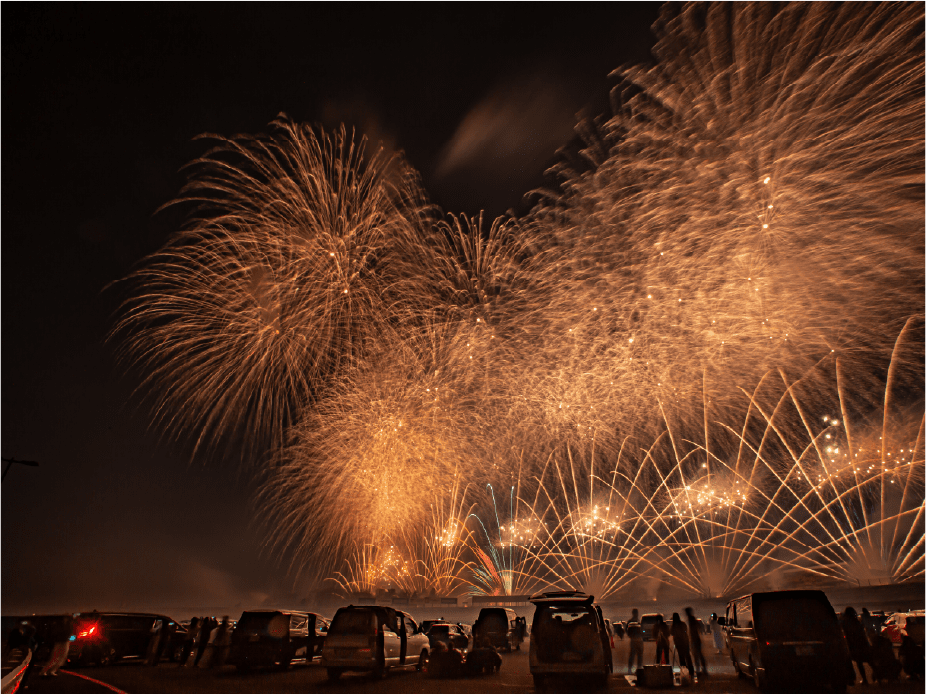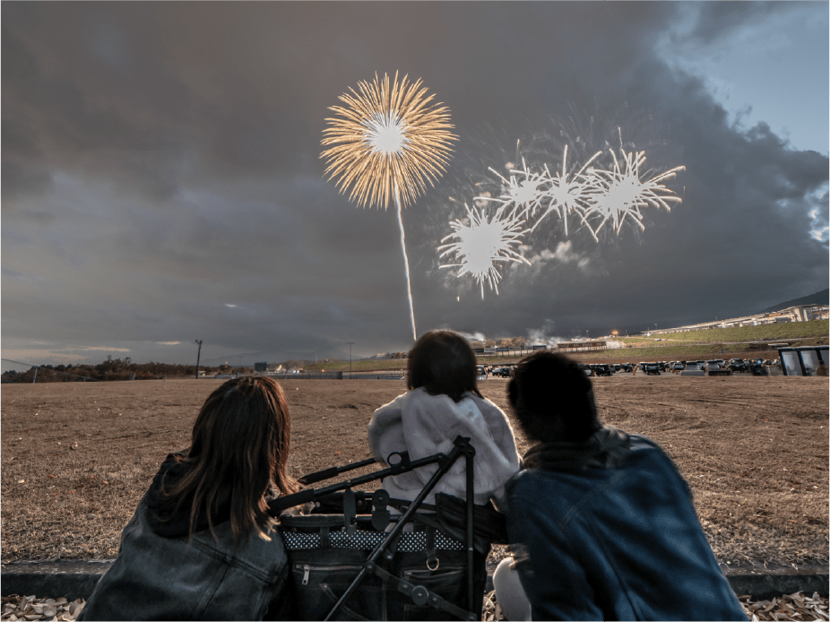 ・花火打上方向に向かって駐車いただけますので、車に乗ったまま花火観覧可能。ご来場の時も、花火観覧中も、お帰りの時もずっと車から降りて歩く必要はありませんので、ご高齢者、小さなお子様も一緒にご来場いただけます。