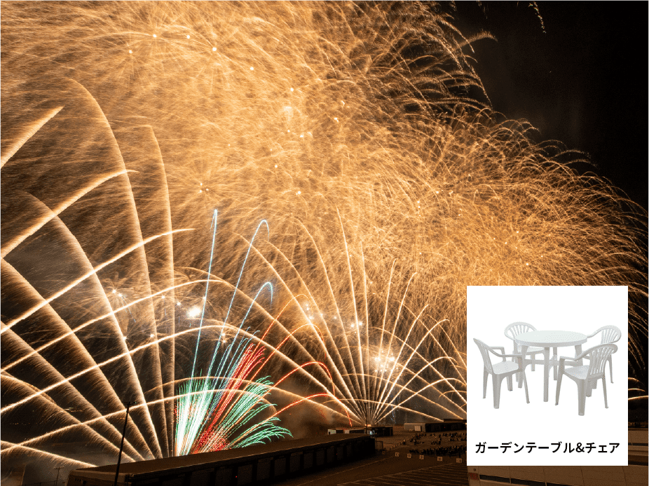 ・同エリア内に、ご持参いただいたシートを敷いたりチェアをおけるフリーエリアも完備。屋外に出て至近距離の花火を観覧することも可能です。