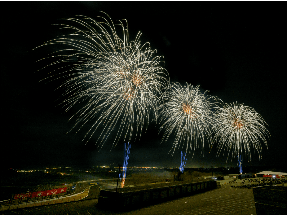 ・ホームストレート全体を一目で見渡せます。少し斜めの角度ではありますが車と花火の共演がよく見えます。グランドスタンド席に比べると花火全景も視界に入り見渡せます。
