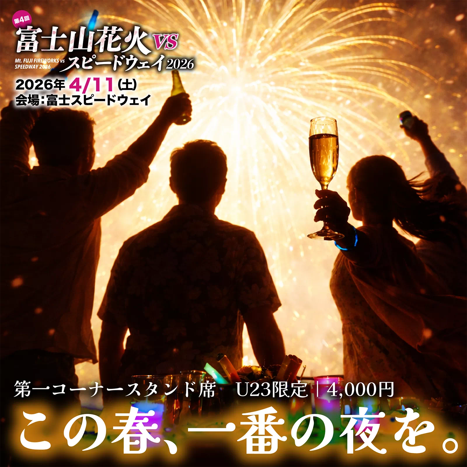 富士スピードウェイの人気観戦ポイント「第1コーナースタンド」を、U23限定で特別開放します。昼はサーキット走行、夜は迫力の花火ショー。同世代の仲間と集まって楽しめる特別エリアです。