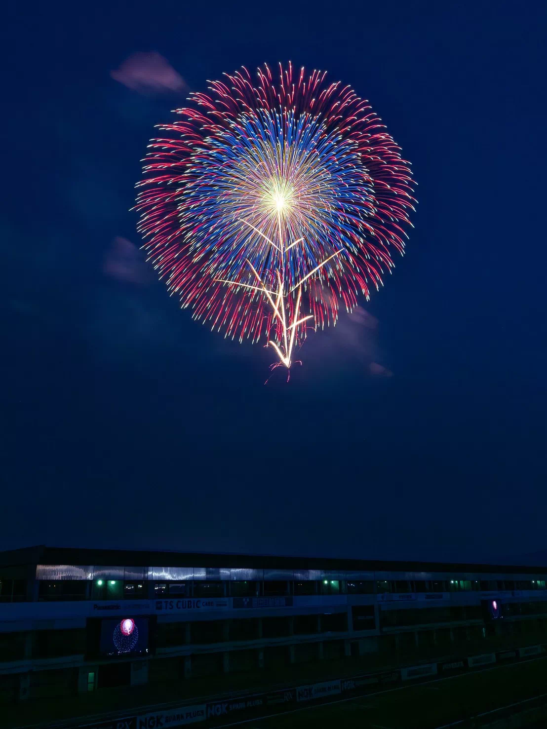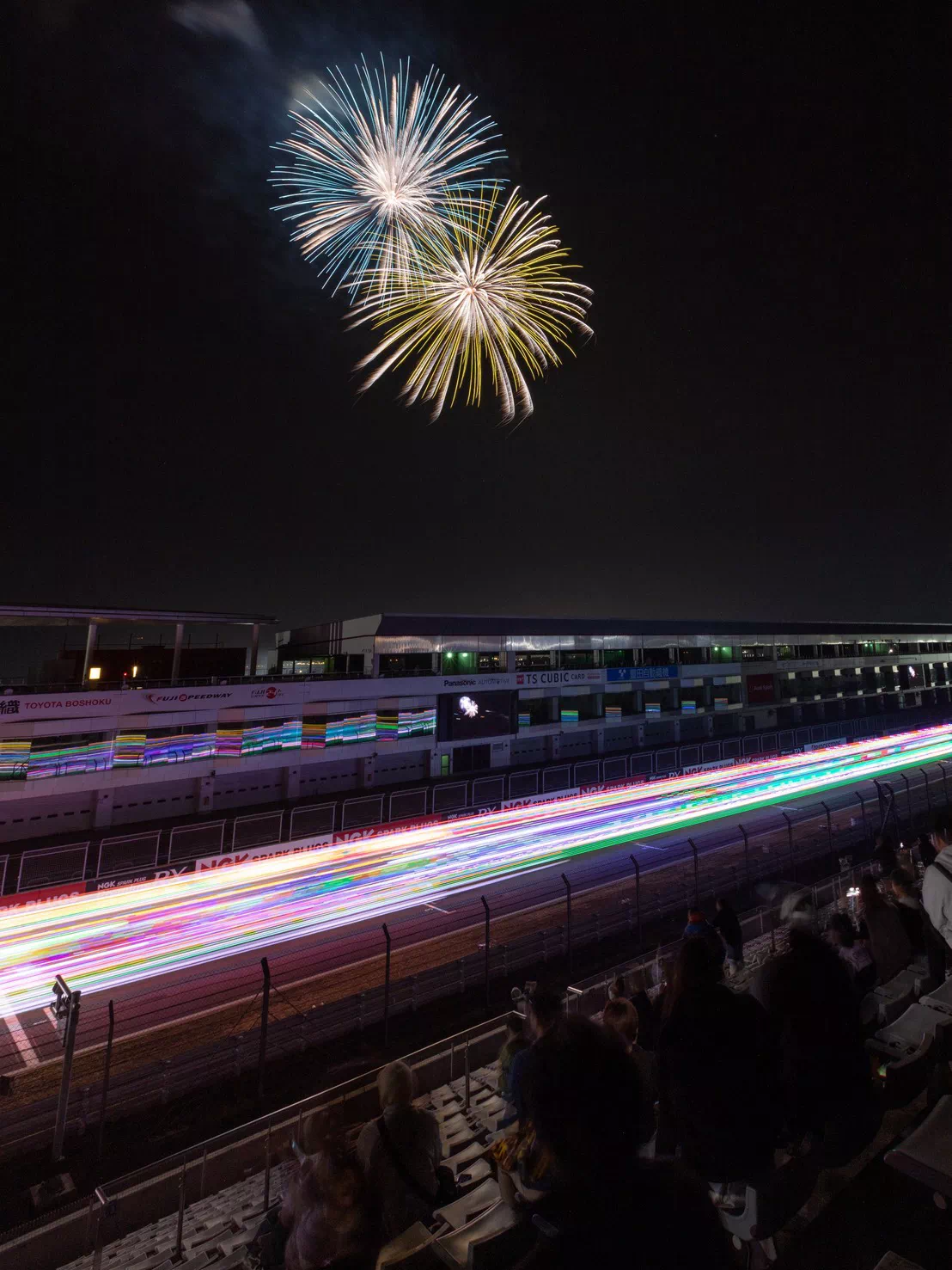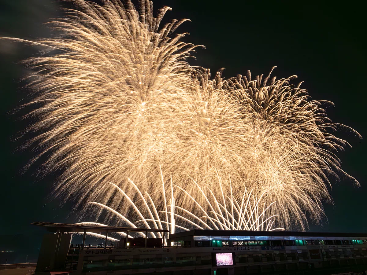 尺玉・2尺玉をほぼ正面から狙え、劇場型花火の立ち上がりと広がりを最適な角度で撮影できます。サーキット走行車が映り込む瞬間も作品の魅力に。