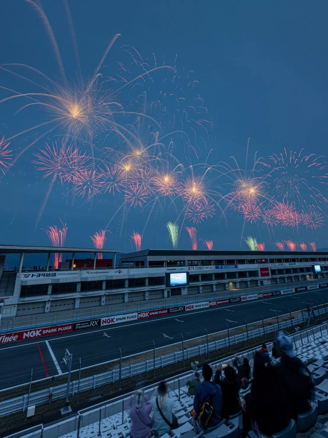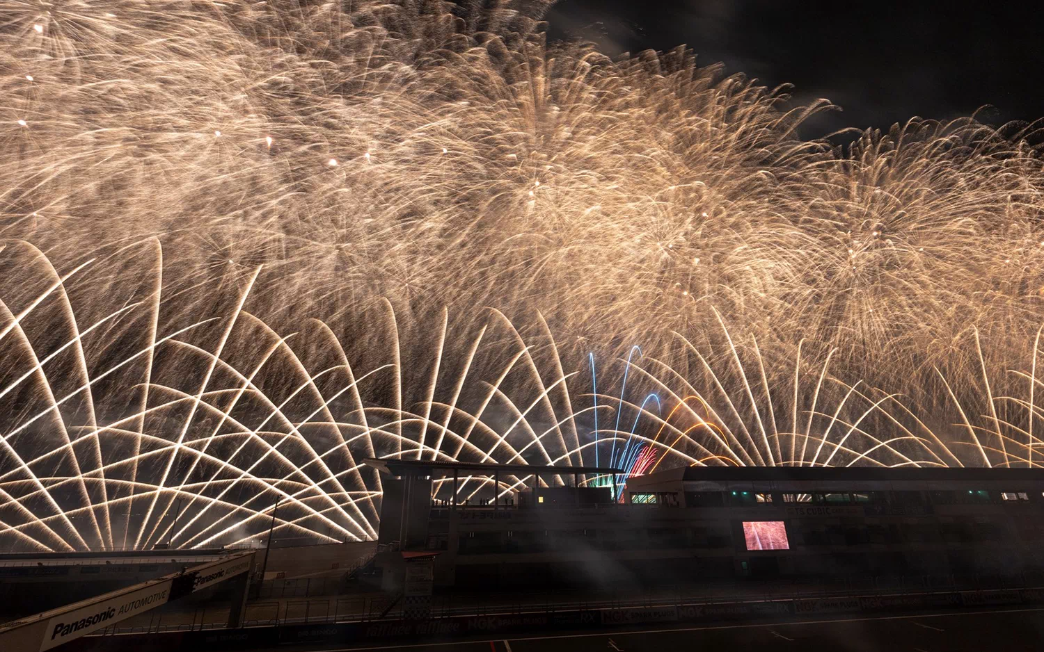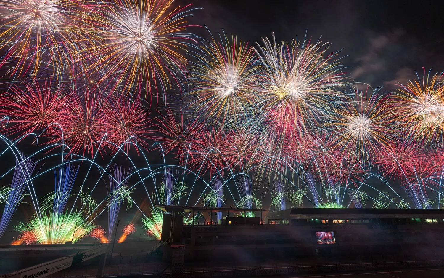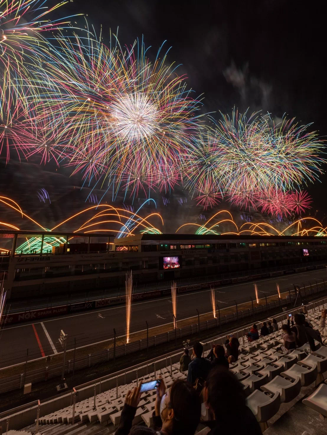 花火とサーキット演出を真正面で楽しめる特等席。空と横一線に広がる演出を “劇場のど真ん中” のような迫力で味わえます。