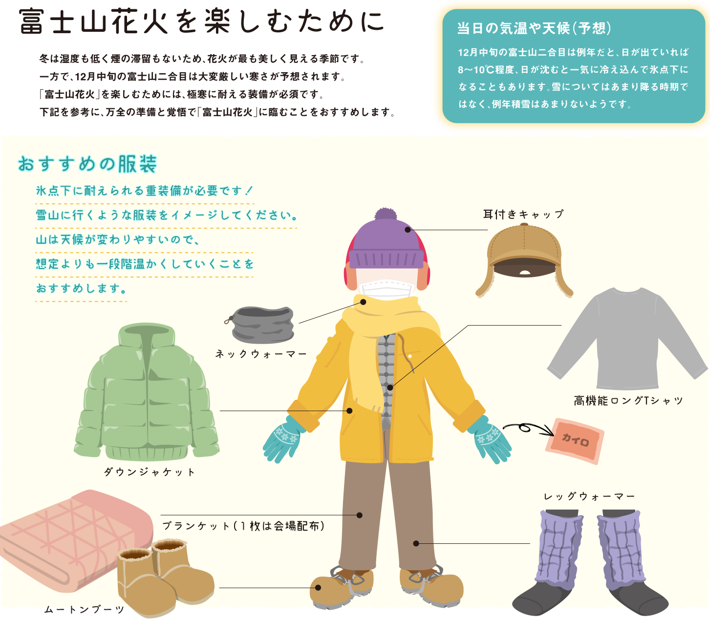 *この時期は富士山二合目は日が暮れると気温が氷点下になることもあります。防寒着着用の上、防寒グッズ等もご用意いただくことをお勧めいたします。防寒アイデアに関しては随時、公式サイト・SNSにてアップいたします。