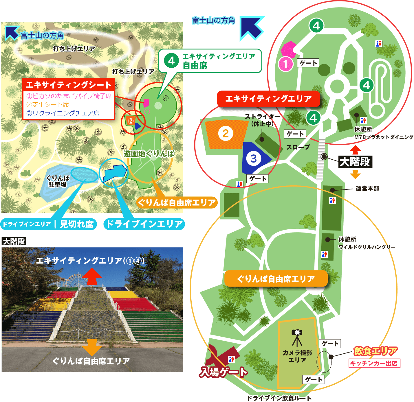 自由にお好きな場所でシートを広げて、富士山を背中に打ち上がる雄大な花火の「全景」をゆったりと観覧することができるエリア。