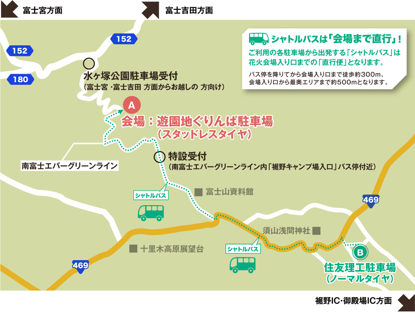 裾野、御殿場IC方面からお越しの方:特設受付(南富士エバーグリーンライン内「裾野キャンプ場入口」バス停付近)